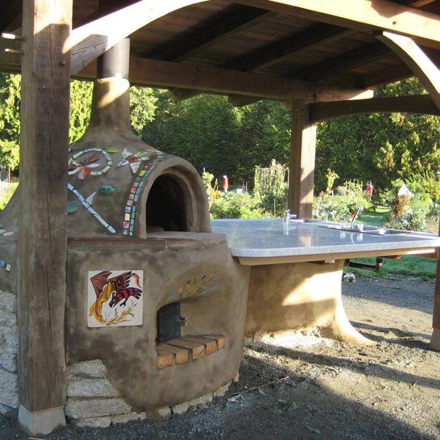 A sheltered outdoor kitchen will become the social and practical heart of food life on the land. Here we will: